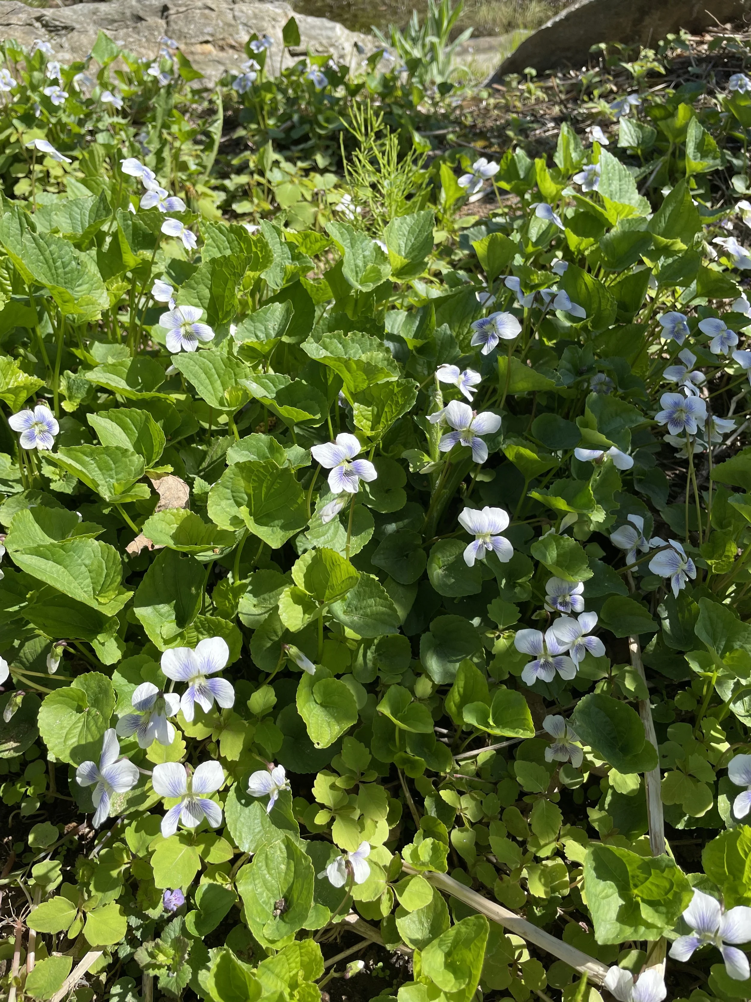 The Rain Garden: Just outside the studio there’s an accidental and ephemeral rain garden. In Spring, a pair of mallards spends time courting. Wood frogs and peepers, and later on green frogs, come and go. In the very wet part. the mix of plants changes from year to year. Sedges, bog iris, water pepper and arrowvine are reliable anchors, along with sensitive fern. I pull out the bigger plants to keep the view to the raised garden on the back side of the water.